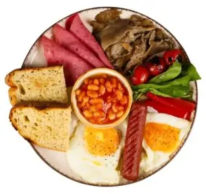İngiliz Kahvaltı 520 TL Biber, Kızarmış Ekşi Mayalı Ekmek, İstiridye Mantarı, İngiliz Fasulyesi, közlenmiş çeri domatesi, kızarmış dana jambon, 2 adet göz yumurta, dana sosis,