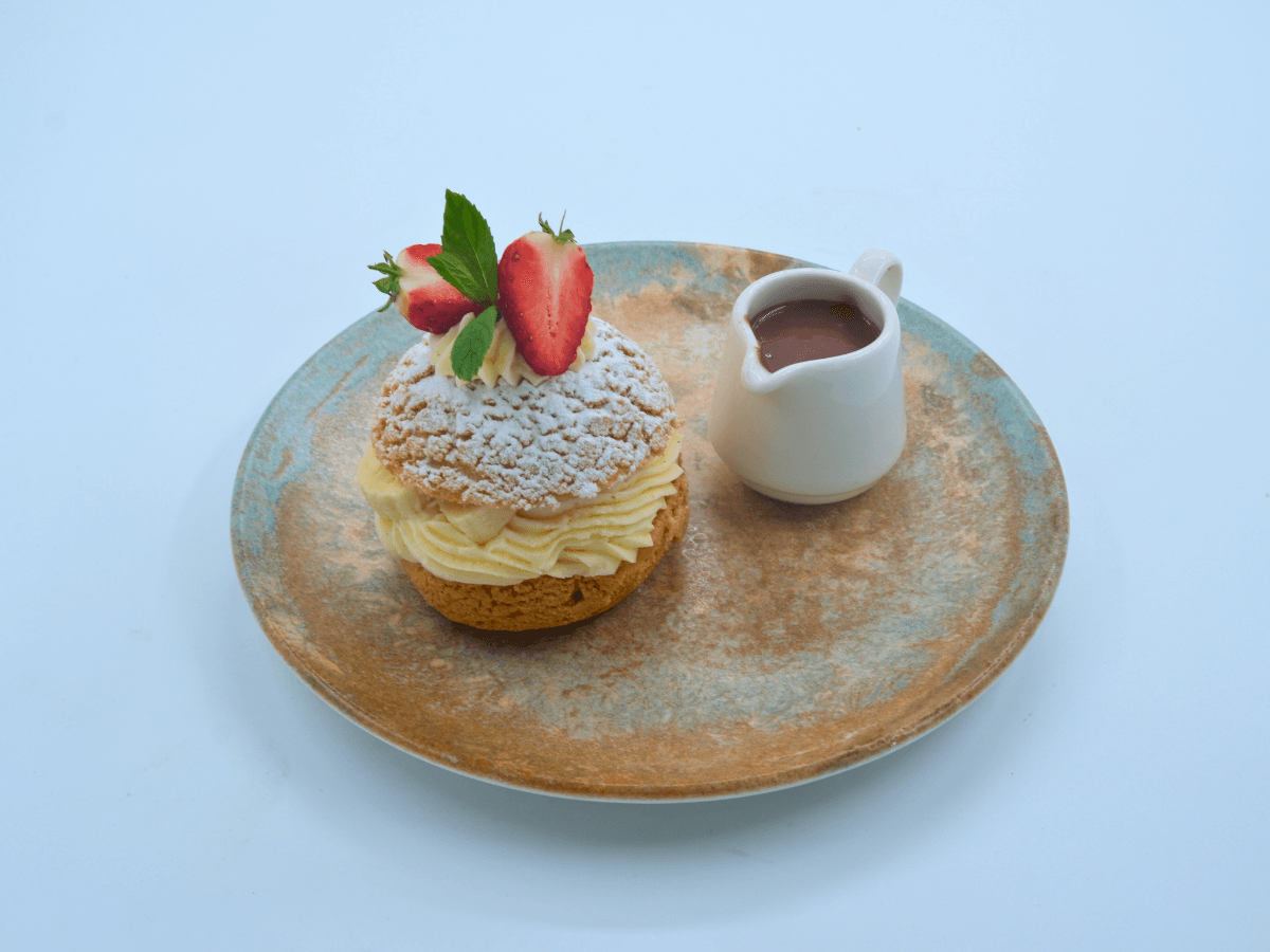 Taze sıkılmış portakal suyu ile servis edilir.