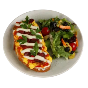 Salamlı Scrambled 550 TL Cheddar Peyniri, 120 Gr Kruvasan, nar ekşili salata, çırpılmış yumurta, akdeniz sosu, kızarmış macar salam,