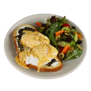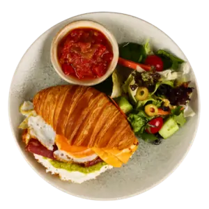 Füme Etli Kruvasan 600 TL Göz Yumurta, Cheddar Peyniri, 120 Gr Kruvasan, Avokado Püresi, labne peyniri, nar ekşili salata, akdeniz sosu, füme antrikot,
