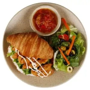 Çıtır Tavuklu Kruvasan 560 TL 120 Gr Kruvasan, labne peyniri, nar ekşili salata, akdeniz sosu, çıtır yeşillik, panelenmiş çıtır tavuklar, mayonez,