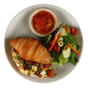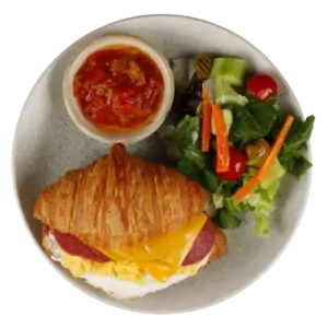 Sucuklu Peynirli Kruvasan 560 TL Kabak Çekirdeği, 120 Gr Kruvasan, çırpılmış yumurta, akdeniz sosu, mayonez, sucuk ve peynir kızartması, zeytinli taze mevsim salata,