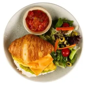 Avakadolu Bonita Kruvasan 560 TL Cheddar Peyniri, 120 Gr Kruvasan, Avokado Püresi, labne peyniri, nar ekşili salata, omlet yumurta, akdeniz sosu,